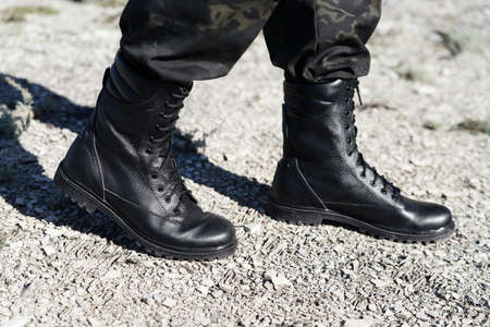 Army black boots for men on laces for outdoor activities stand on a background of stone. Caucasus, Russia