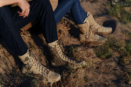 The soldiers' legs are dressed in ankle boots and camouflage pants. Close-up, selective focus.