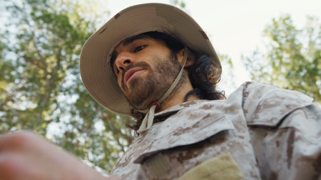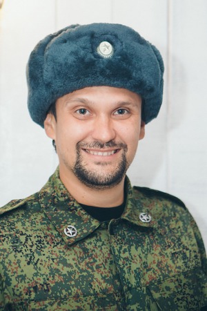 Portrait of attractive male soldier wearing camouflage uniform looking at camera