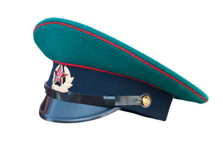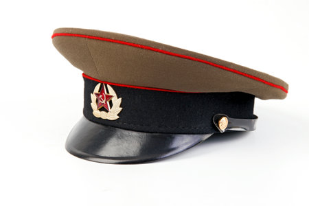 Cap with red star and George ribbon, headdress serviceman Red Army Soviet Union, on white background