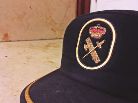 Madrid / Spain; 08/21/2018. Official Civil Guard cap (police force of a military nature in Spain). Green cloth cap with the golden emblem.