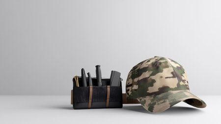 various military camouflaged caps with pouch laying on stacked cardboard boxes.