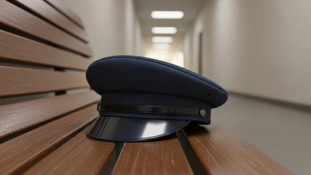 A navy blue police hat cap in front of a navy blue background with bokeh