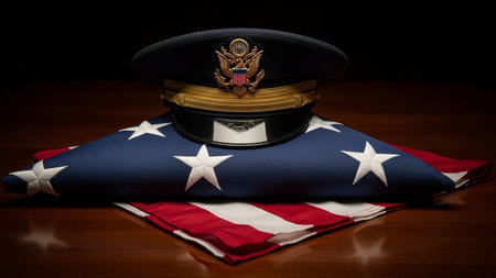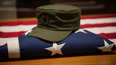 Camouflage Jungle Green Hat, American Flag & Service Ribbons On Wooden Desk