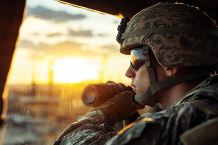 A soldier looks through binoculars at a sunset while stationed at a military outpost, focusing intently.