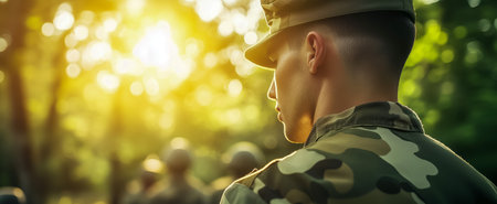 A soldier in camouflage uniform observing while sunlight filters through the trees