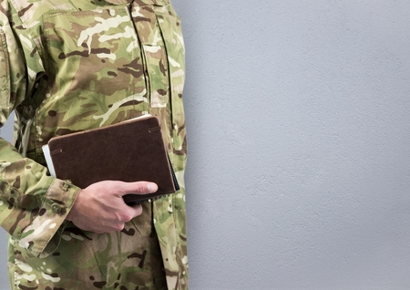 Digital composite of soldier with books, concrete wall