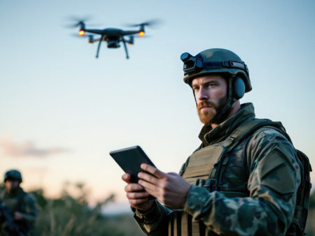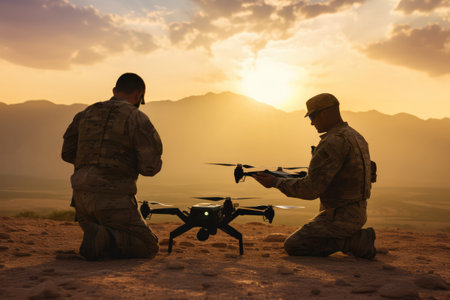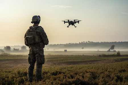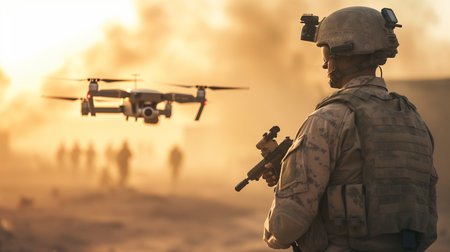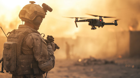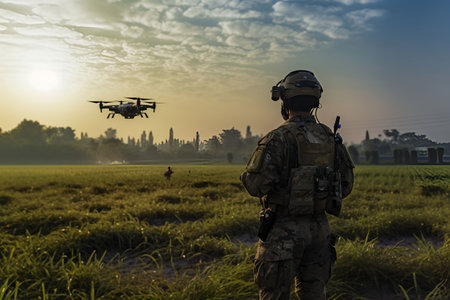 Tactical soldier stands against a stunning sunset, observing a flying drone, highlighting the integration of technology in military operations and surveillance, AI generated
