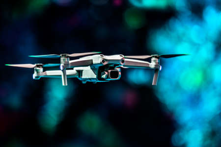 A flying drone. Airborne quadcopter. Also known as a drone or UAV, Unmanned Aerial Vehicle. Drone with camera on a colorful background with copy space.
