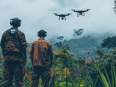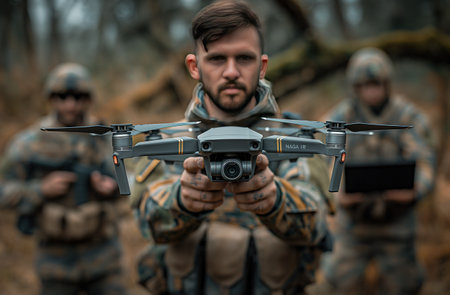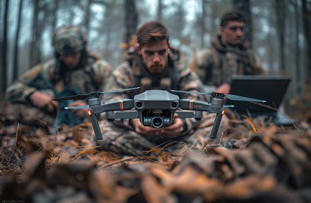 Soldiers in camouflage are using aerial drones for tactical reconnaissance.