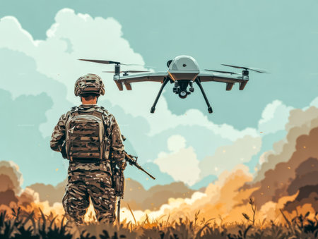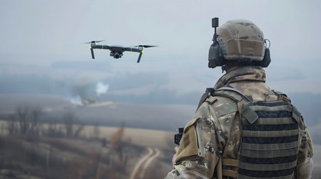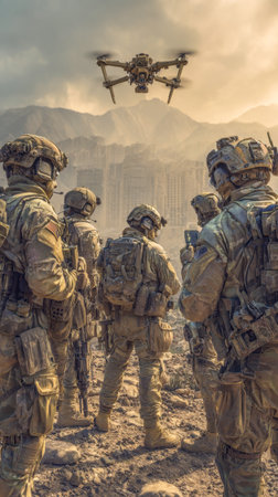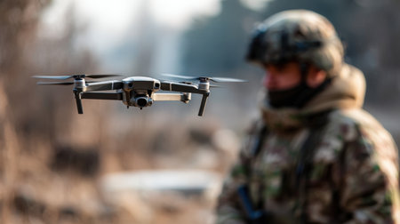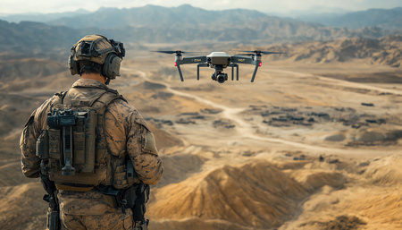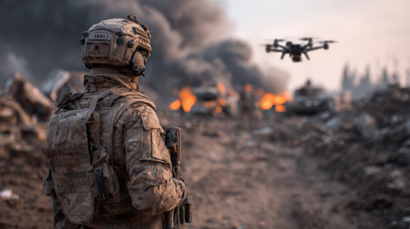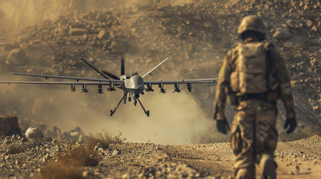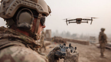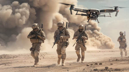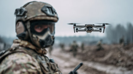 A soldier equipped with advanced tactical gear stands ready as a drone hovers nearby amid a dusty landscape, capturing crucial scouting information during a military operation.