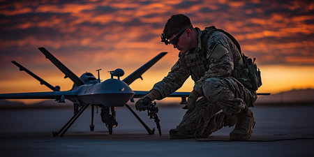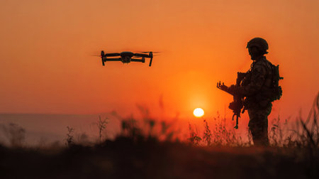 A soldier stands against a vibrant sunset, monitoring a drone's flight as it hovers nearby. The silhouetted figure focuses on a device, showcasing modern military technology in action.