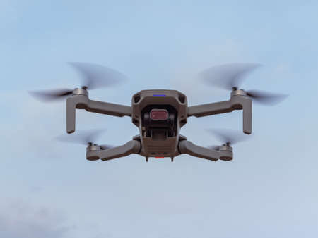 Grey drone with camera flying in the air outdoors. Little drone flying outside in sky.