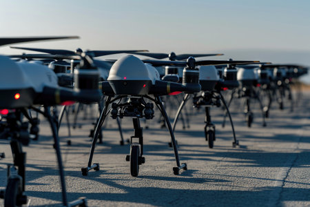 A photo capturing a vast gathering of black and white unmanned aerial vehicles, An army of drones lined up on a launching pad, AI Generated