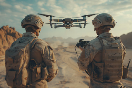 Two soldiers in the desert are flying drones equipped with cameras