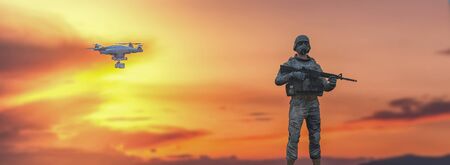 Military soldier controls drone for reconnaissance operation of enemy positions. Concept using quadrocopters in smart war.