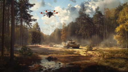 a drone armed with explosives hovering over a tank amidst a lush summer forest, vividly depicting the stark contrast between beauty and danger in the saturated summer colors