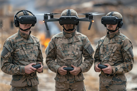 Three military operators in virtual reality glasses control a quadcopter. Modern military weapons.