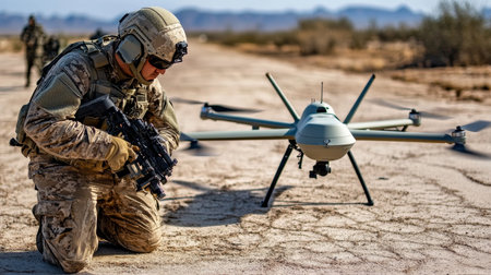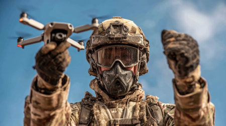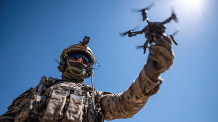 A soldier dressed in tactical gear and a mask controls a small drone in a desert setting. The clear blue sky contrasts with the sand, highlighting the modern military technology in use.