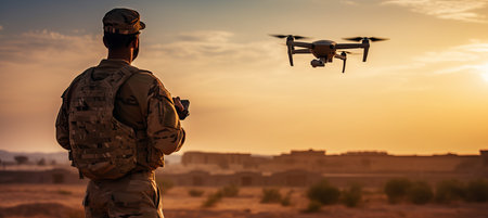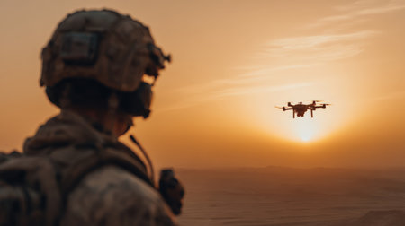 A soldier stands in a desert area, controlling a drone as the sun sets, creating a beautiful backdrop. The scene highlights the technology used in modern military operations.