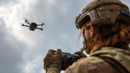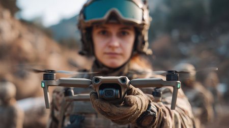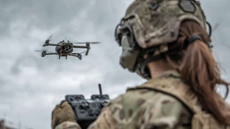 A woman soldier in camouflage uniform controls a drone with a remote in a mountainous area. The cloudy sky sets a dramatic backdrop for the advanced technology in use.