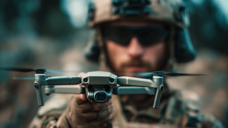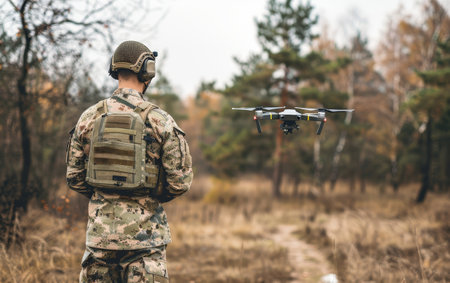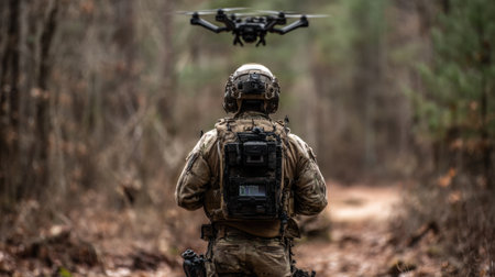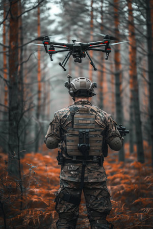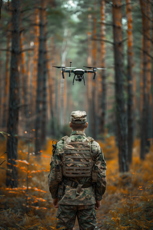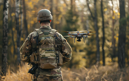 A soldier in tactical gear operates a drone in an outdoor setting. The image showcases the combination of technology and nature, with autumn colors enhancing the scene.