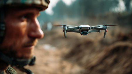 A soldier with dirt on his face concentrates on a drone hovering nearby. The environment suggests a rugged, outdoor location where military training occurs, likely at dusk.