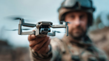A military soldier holds a drone in a dusty environment. Field precision.