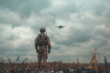Soldier in Camouflage Observing Drone Flight Against Stormy Sky, Technology in Military Operations.