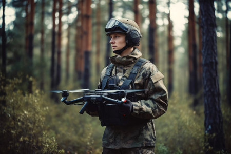 Soldier drone forest. security computer. fictional person. Generate AI