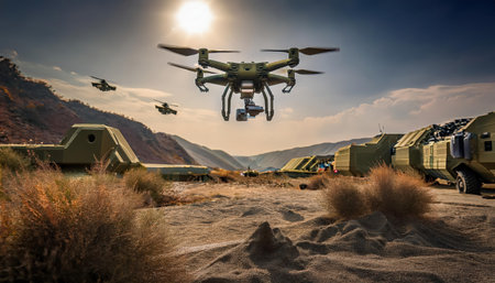 Firefly drones are engaged in aerial reconnaissance operations above a military base, showcasing advanced technologies in a rugged desert landscape under a bright sun.