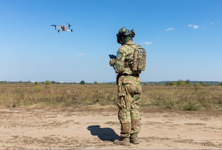 Soldier wearing camouflage uniform and protective headphones operates a military drone flying over a dry field during a military operation
