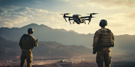 Two soldiers with their backs to the camera launch a full-size military combat drone into flight, ready for a critical mission. AI Generative AI
