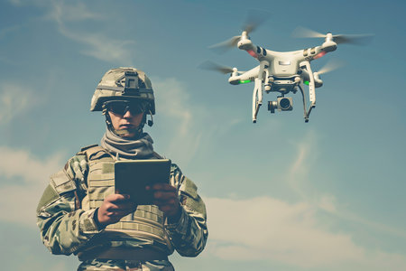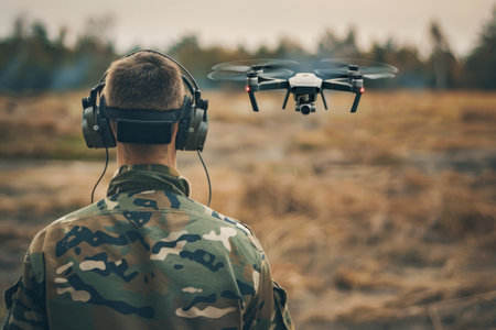 Soldier in military attire with headset and goggles attentively monitoring drone aircraft