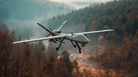 Military drone in flight. High-contrast, cinematic shot over desert. Dynamic and powerful. Ideal for defense, technology, war.