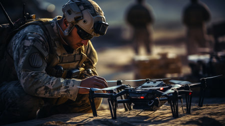 Soldier launches a drone to fulfill an important mission. AI generated image