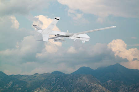 An unmanned vehicle flies over the clouds control and tracking the sky over the territory