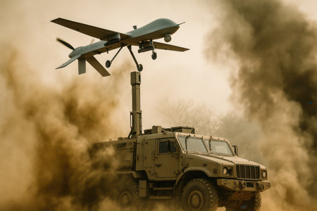 Unmanned aircraft hovering above a military vehicle in dusty environment. Smoke and sand create dramatic atmosphere. Concept of modern warfare and aerial support.