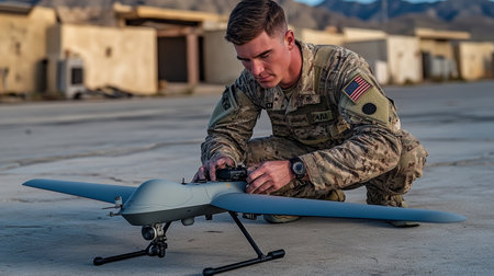 Soldier Inspects Drone at Twilight in Military Camp, Preparing for Air Support Operation Patrol
