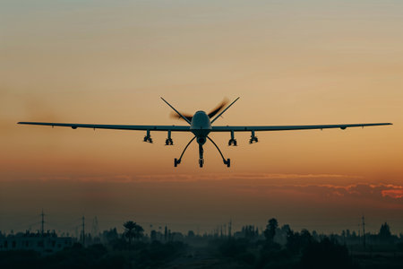 Fixed wing military drone flying in the air against the background of a hazy orange sunset