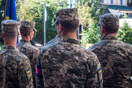 Legs of real soldiers in military boots and clothes standing in formation on the grass. Background with copyspace.
