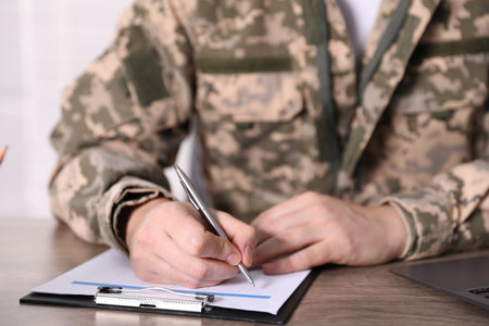 Military education. Student in soldier uniform learning at wooden desk indoors, closeup