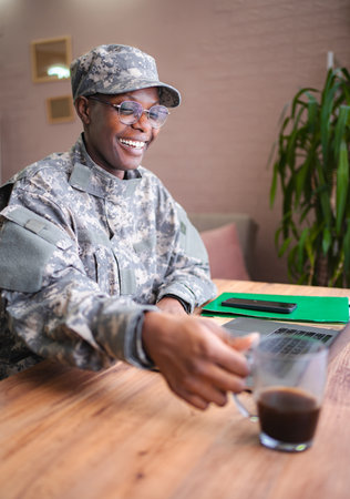 Smiling african american female soldier drinking coffee during work break at home