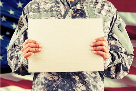 Portrait of a soldier holding white board