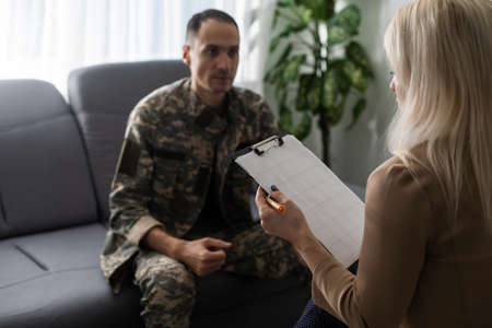 Young psychotherapist taking notes while listening young veteran who talking about his problems.