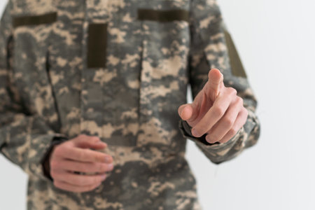 cropped view of soldier in uniform pointing with finger isolated on white.