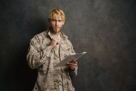 White military man wearing uniform posing with clipboard isolated over black background