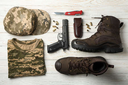 Military accessories on white wooden background, top view