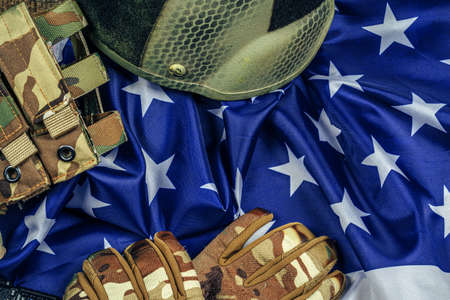 Set of military equipment and accessories on dark background. selective focus.