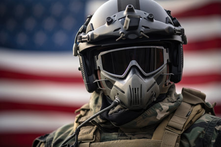 American soldier in helmet with american flag on background, closeup, AI Generated